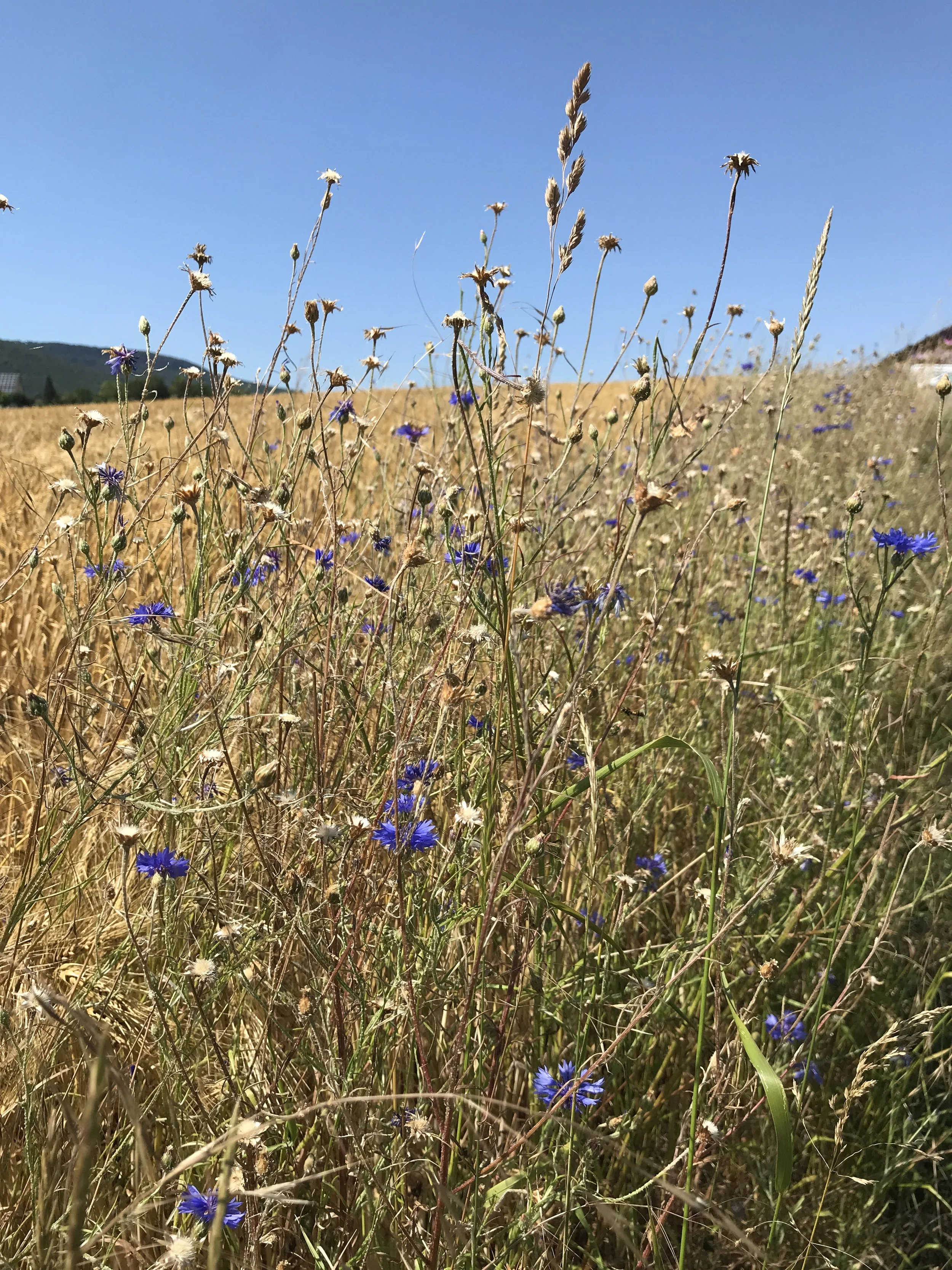 Dort stehen kleine blaue Blumen am Gerstenfelder. Die Blume sind viel weicher und leichter wie eine Feder. Ich habe sie in den Korb vorsichtig gesammelt. Überall blühen bunte vermischte Blumen und die Bienen schwärmen für sie.